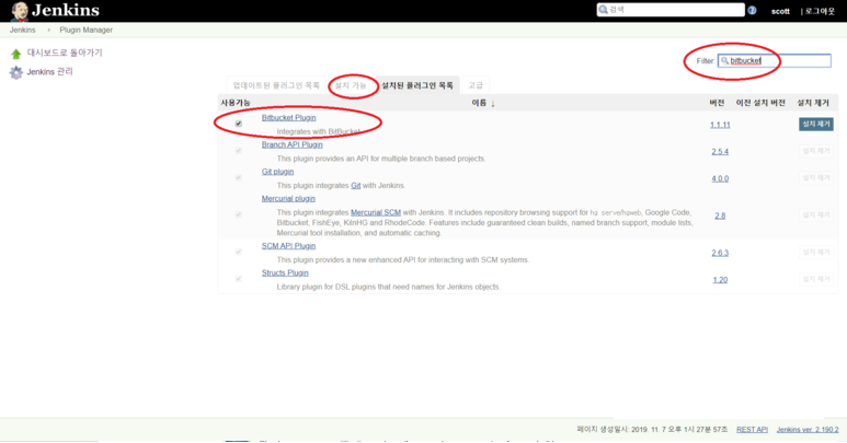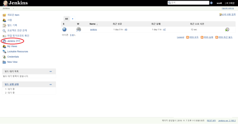 일단 bitbucket 플러그인을 설치해야하기 때문에 jenkins 관리로 들어갑니다.