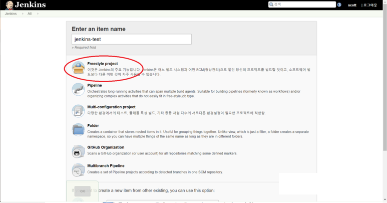 이름을 설정하고 빨간 원으로 표시한 freestyle project를 선택하여 하단에 ok 버튼을 누릅니다.