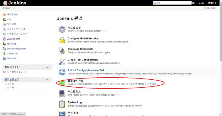이제부터는 jenkins에 접속하여 설정을 하겠습니다.