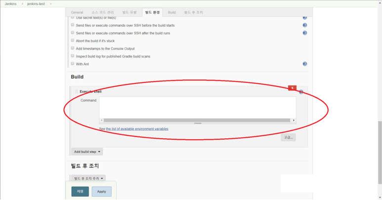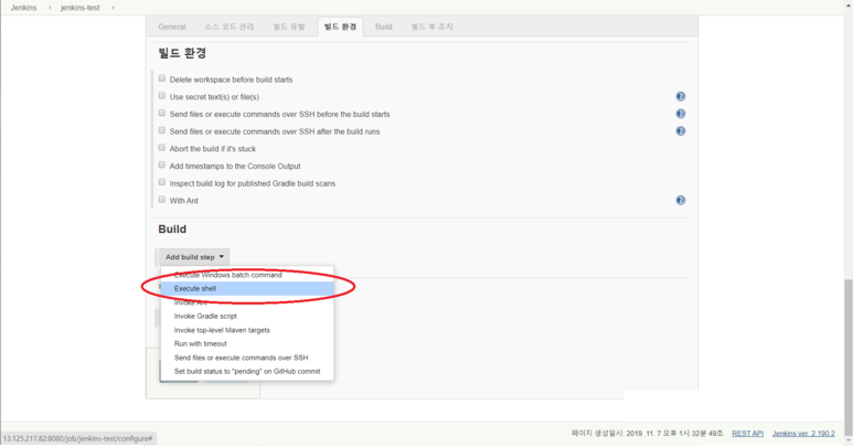 마지막으로 Build 부분에 Execute shell을 선택하면