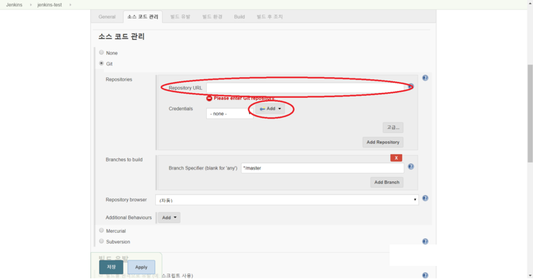 일단 첫번째 Repository URL에 본인의 repository url 주소를 적어줍니다. (clone 할 때 사용하는 주소)