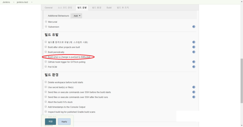하단으로 내려가서 빌드유발 부분에 Build when change in pushed in bitbucket 항목에 체크합니다.