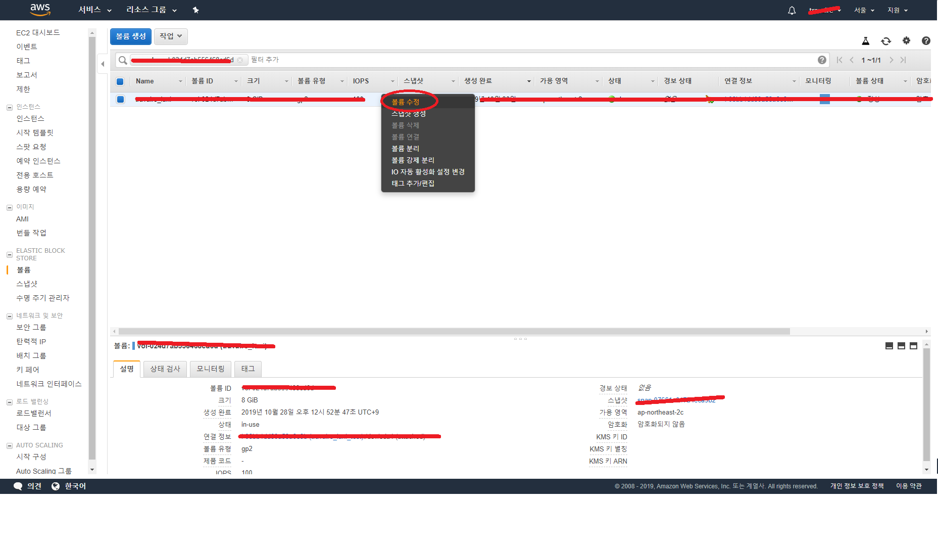 "EBS ID"를 클릭하여 들어온 화면에서 인스턴스를 오른쪽 마우스로 클릭하면 나오는 창에서