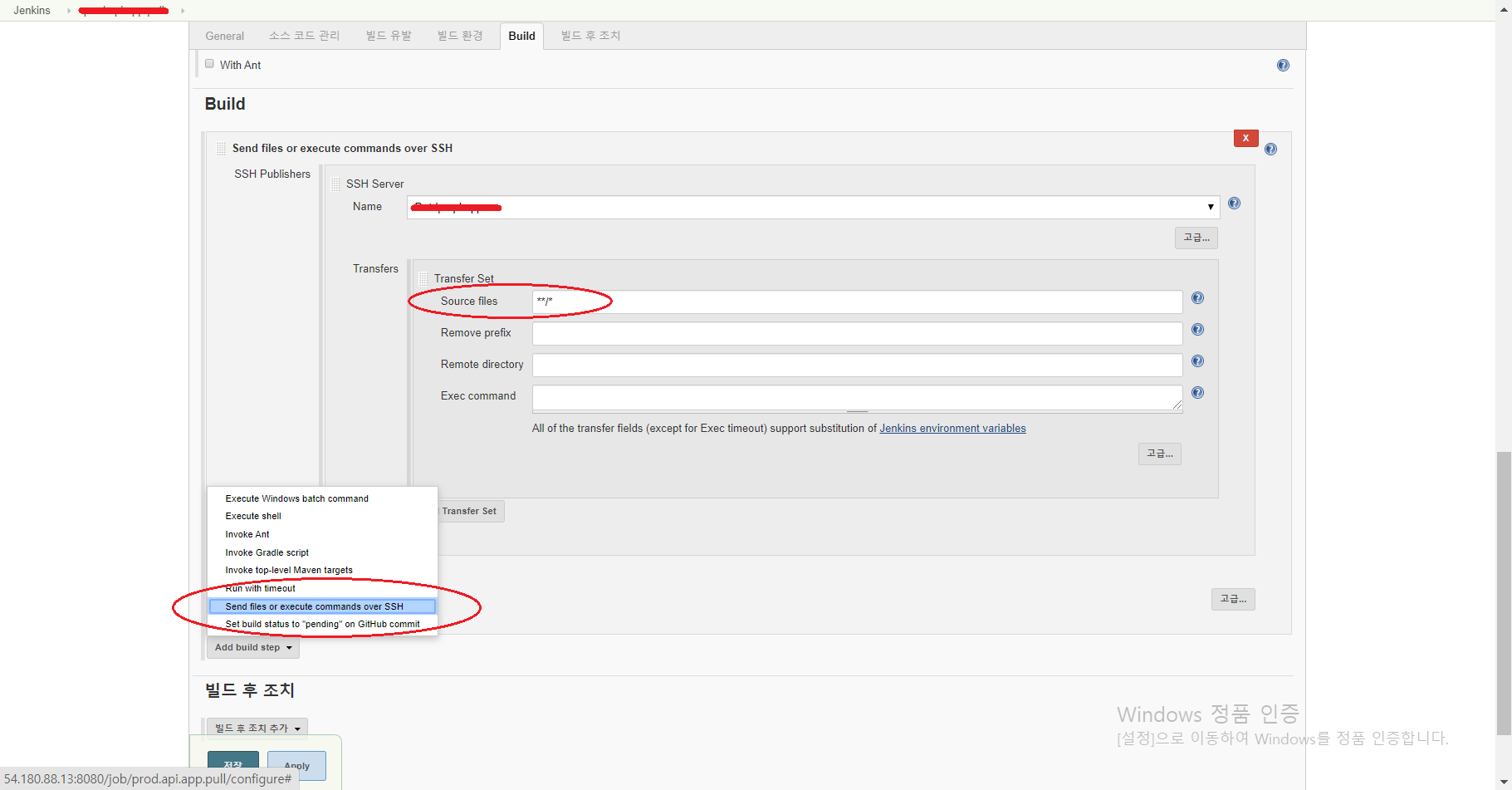 "Build" 항목으로 가서 아래 셀렉트 박스를 클릭하면 'Send files or execute commands over SSH'항목을 클릭하면