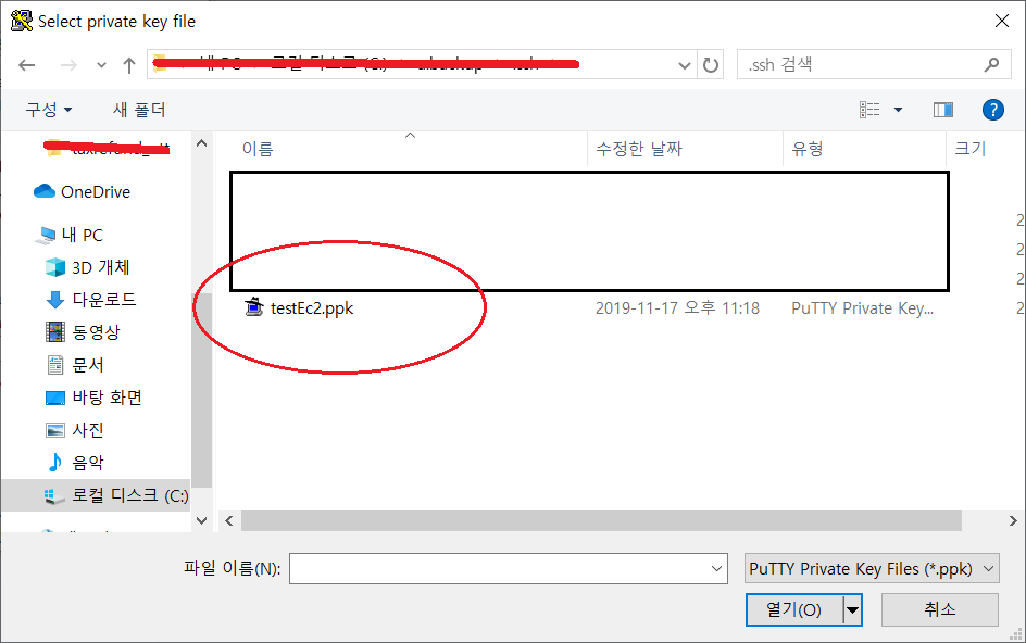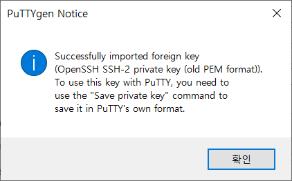 private key를 생성한 키와 같은 이름으로 저장합니다. (확장자는 따로명시해주지않아도 자동으로 *.ppk로 생성됩니다. )