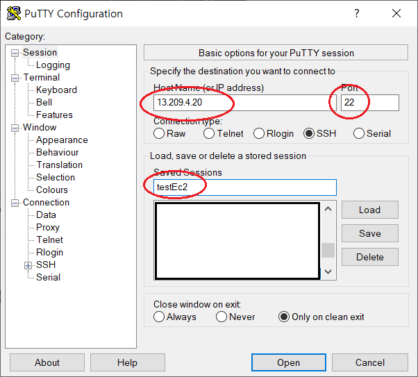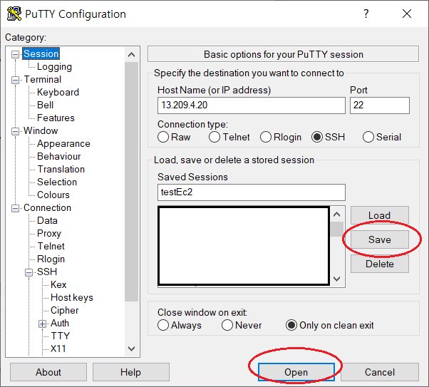 그리고 putty에서 왼쪽 "session" 경로로 오게되면 초기 화면이 뜹니다.