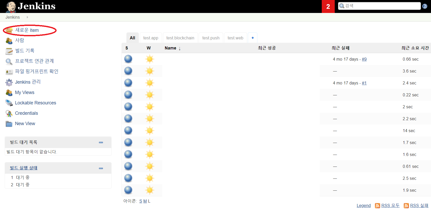 젠킨스 메인 화면에 접속하여 "새로운 Item"을 클릭하여 페이지를 이동합니다.
