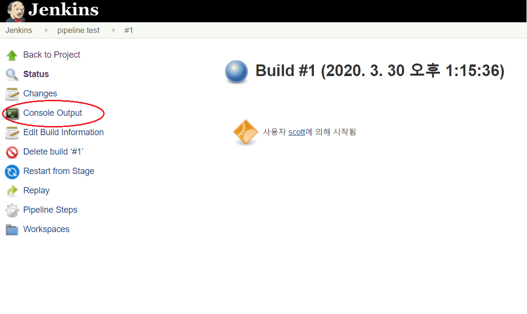 위와같은 빌드 화면에서 "console output" 버튼을 클릭합니다.