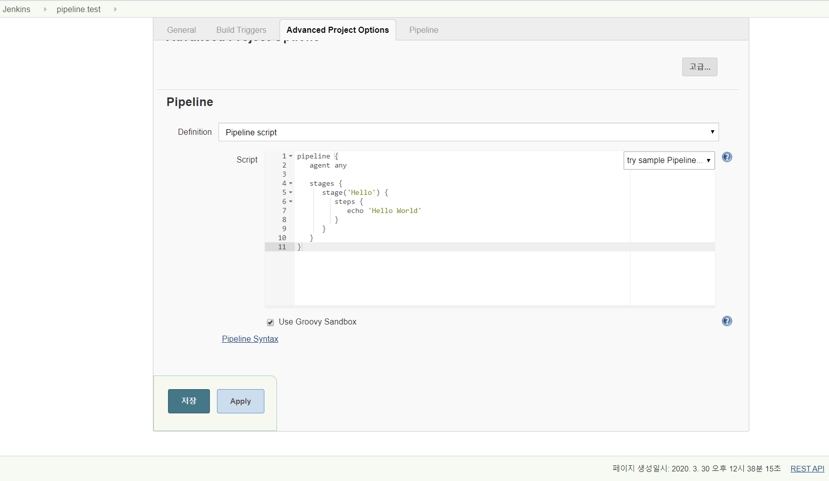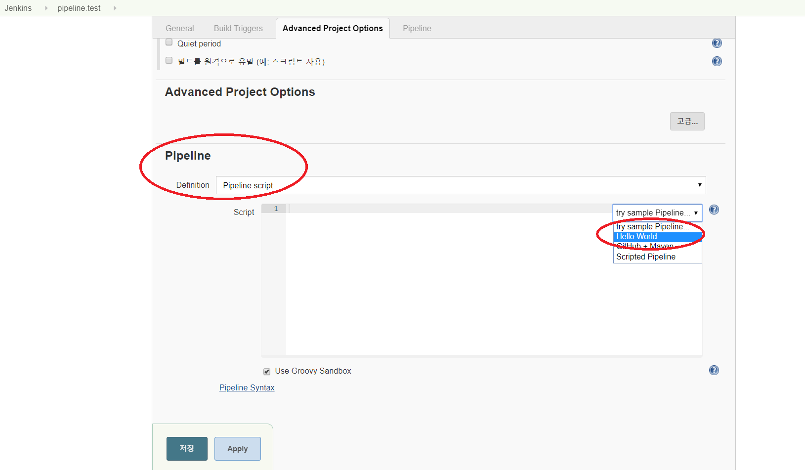 위 화면에서 Pipeline이라는 섹션에 script를 작성하면 됩니다.