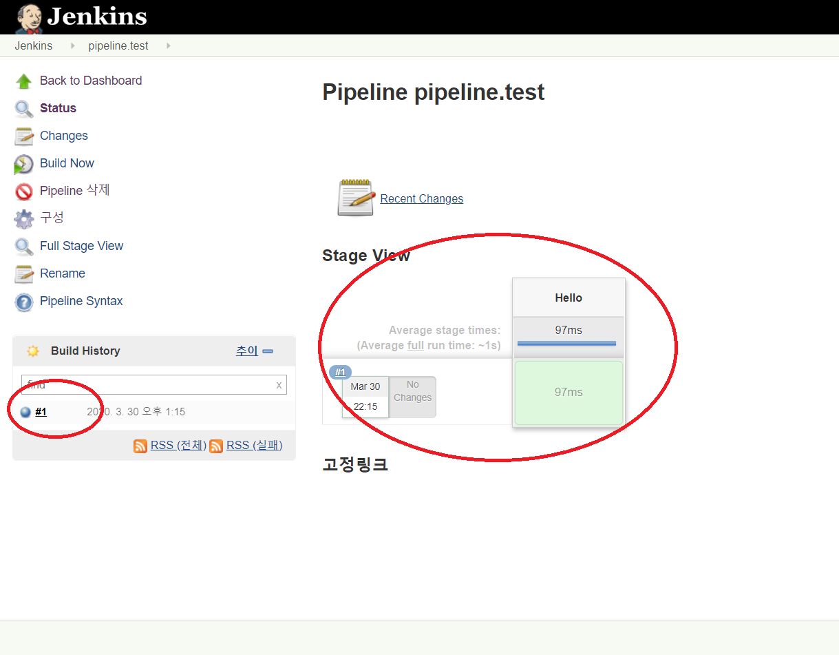 좌측에 해당 pipeline의 빌드 number와 함께 빌드의 성공 여부가 표시됩니다.