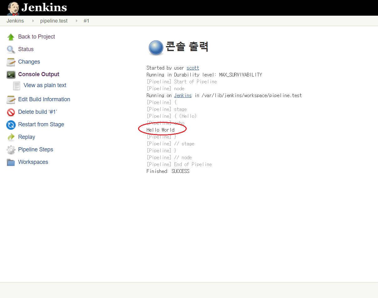 수행한 job의 로그는 왼쪽에 build number를 클릭해서 들어가면 확인할 수 있습니다.