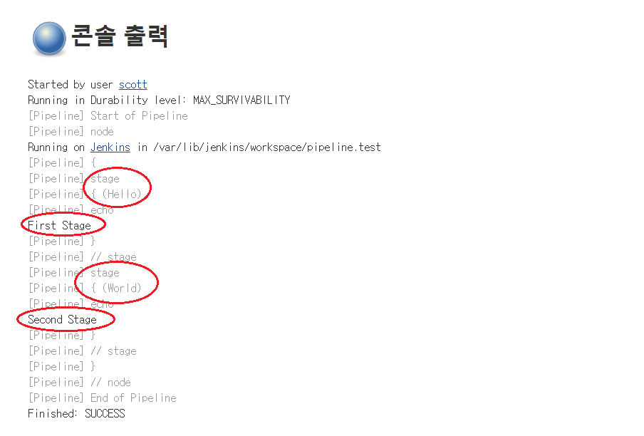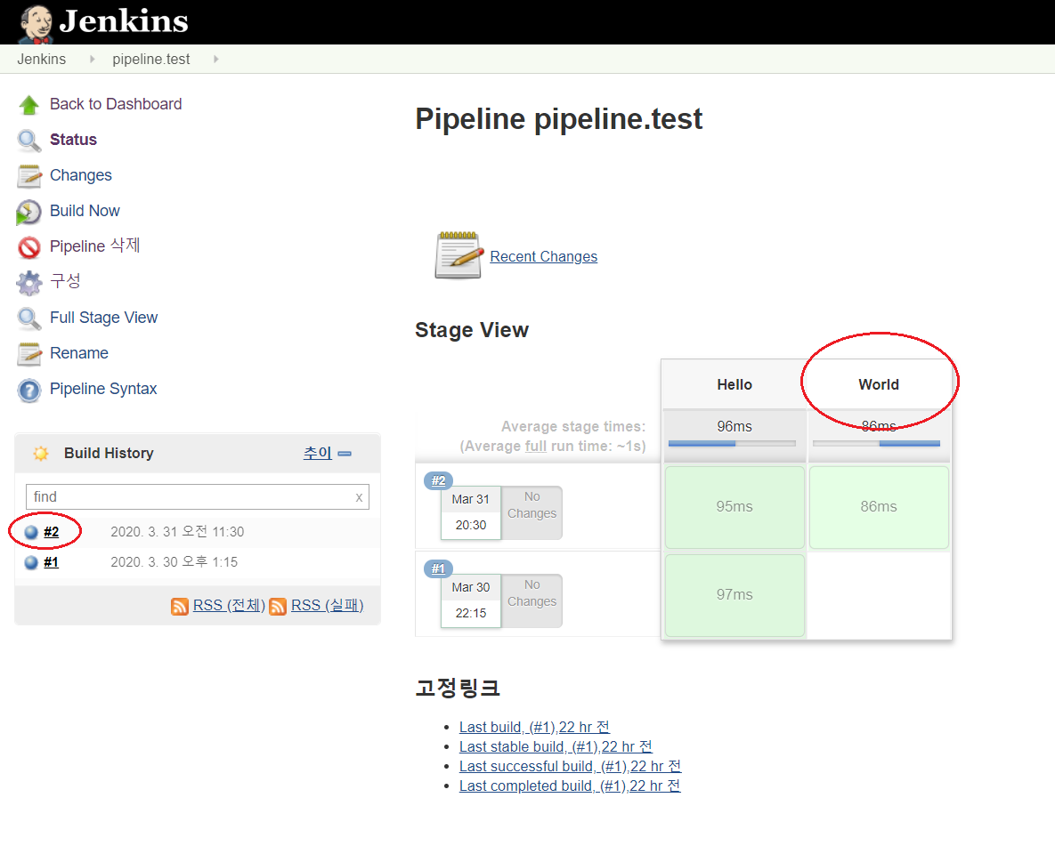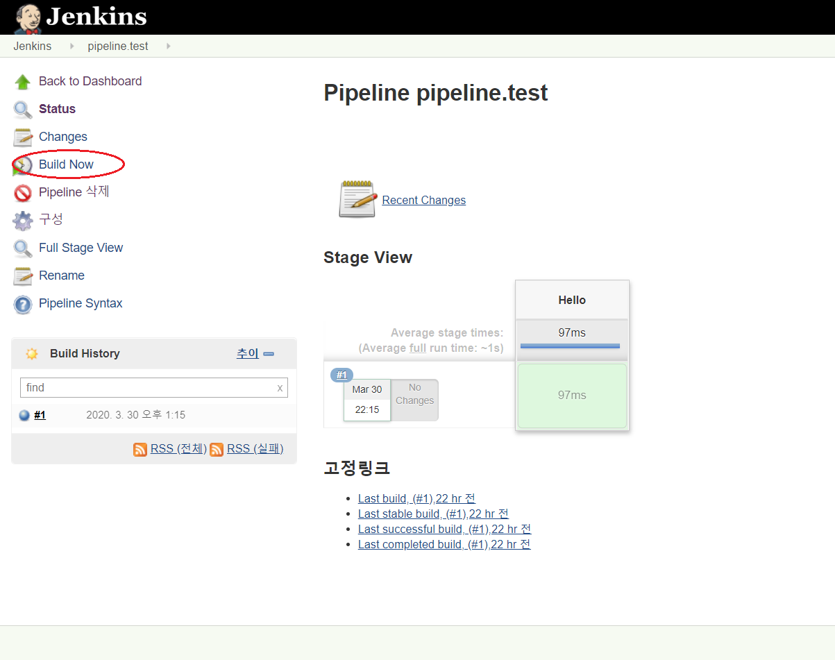 위의 코드를 실행하면 stage가 하나가 생겨서 jenkins 콘솔에 build가 완료되었을 때 하나의 블록이 생깁니다.